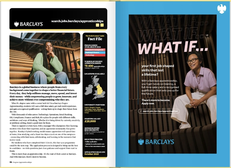 The Sixth Formers' Guide to Degree Apprenticeships is the essential guide to degree apprenticeship opportunities in the UK. Produced in partnership with The Careers & Enterprise Company and the Department for Education and Future Leaders UK, the guide explains how degree apprenticeships offer a work-led, debt-free route to a university degree or professional qualification and a graduate job. It features inspiring insights from Level 6 and 7 apprentices working in different industries & sectors, expert guidance from degree apprenticeship employers, and showcases many of the top degree apprenticeship programmes available in 2026.
